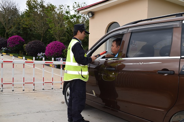 在保山海螺廠區門口,值班保衛人員正在對進出廠車輛進行安全檢查。“中午和夜間,大家最容易麻痹大意、掉以輕心,作為治安保衛人員,越是這種時候,越要打起十二分精神,不能懈怠?!北I胶B葜伟脖Pl班長何康升說。