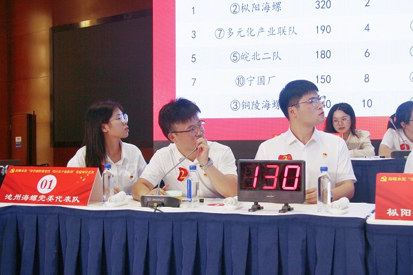 競賽來到第二階段同題共答環節,6支晉級的代表隊全部清零,迎來了新一輪的“大考”。經過13道題目的比拼,寧國廠代表隊率先取得晉級下一輪的“入場券”;樅陽海螺代表隊和省內多元化產業聯隊因得分相同,在經過一輪的加賽后,省內多元化產業聯隊搶得先機,成功晉級。