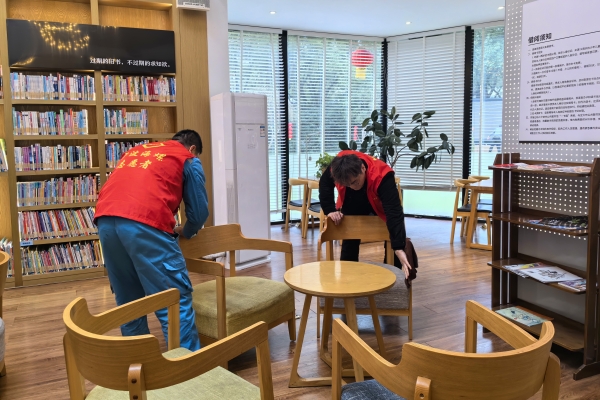 浙江寧波海螺志愿者正在對當地書屋等公共設施進行保潔。