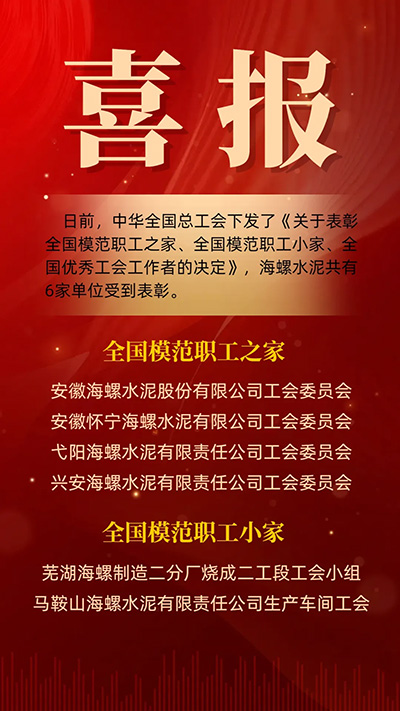 日前,中華全國總工會下發(fā)了《關(guān)于表彰全國模范職工之家、全國模范職工小家、全國優(yōu)秀工會工作者的決定》,海螺水泥共有6家單位獲得表彰。其中,安徽海螺水泥股份有限公司工會委員會、安徽懷寧海螺水泥有限公司工會委員會、弋陽海螺水泥有限責任公司工會委員會、興安海螺水泥有限責任公司工會委員會獲評“全國模范職工之家”,蕪湖海螺水泥有限公司制造二分廠燒成二工段工會小組、馬鞍山海螺水泥有限責任公司生產(chǎn)車間工會獲評“全國模范職工小家”。