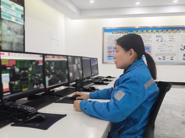樅陽海螺礦山局控操作工胡玉貞正在進行礦車開采智能把控工作,她說:數字化智能礦山系統指揮礦車,就像指揮家在指揮樂隊,工友們在礦場辛勤作業,我用智能化系統為他們提供精準的開采指導,確保每一步都高效有序。
