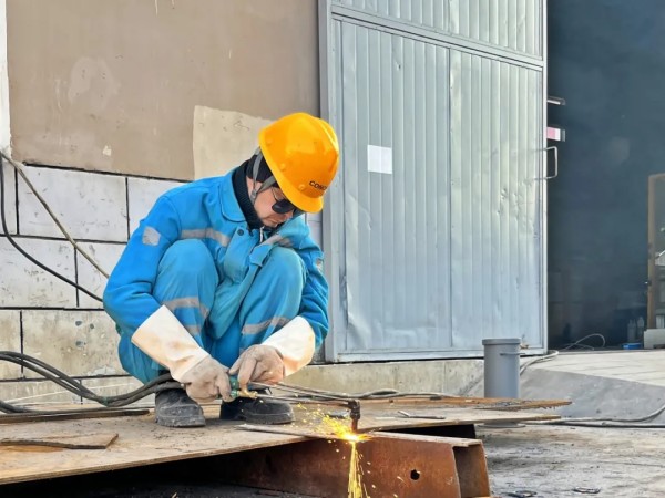 卡爾希海螺維修工貝克正在進行鋼材下料作業,他說:“Payvandchi qo‘lidagi yong‘in – uskunaning barqaror ishlashining kafolati.(用我手中的焊槍,保障設備穩定運行)