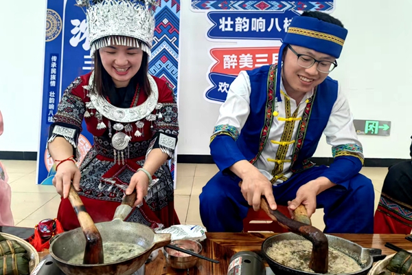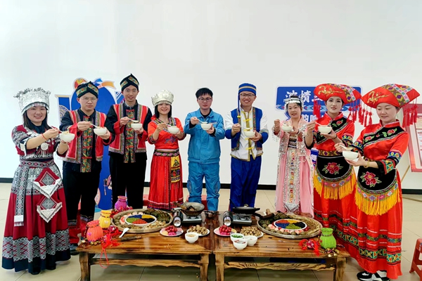 “一口五色糯米飯,吃出山水與情懷”。糯米飯是廣西三月三必吃的小吃之一,壯族家家戶戶都喜歡做五色糯米飯,用于趕歌圩食用,或作祭祖祭神之用,寄托著人們對五谷豐登、生活美滿的期盼。海螺職工們大顯身手,使用紫葉、紅藍(lán)草、姜黃、楓葉等天然植物制作出紫、紅、黃、黑、綠5種顏色的糯米飯,并巧手制作了海螺造型的擺盤,糯米飯香氣四溢,用味蕾感受“三月三”的壯族風(fēng)情。
