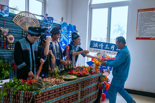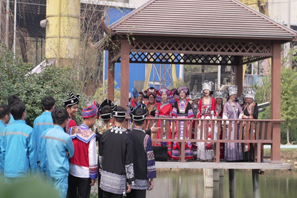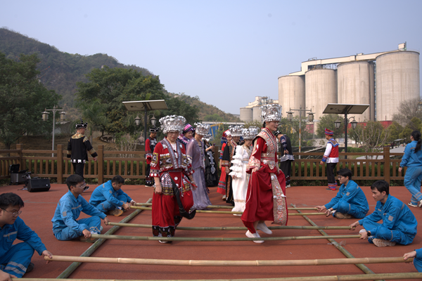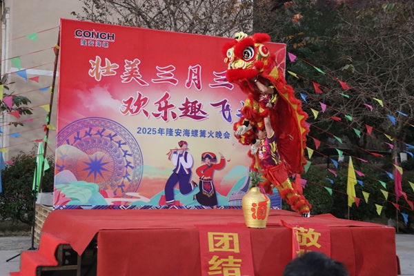 在廣西三月三這一天,人們會進(jìn)行舞龍舞獅表演來慶祝節(jié)日,通過舞龍舞獅表演來展示人們對美好生活的追求和對傳統(tǒng)文化的傳承。“壯美三月三、歡樂趣飛揚”主題文藝匯演在舞獅、醉獅的熱鬧鼓聲中拉開了帷幕。《山歌好比春江水》《什么水面打筋斗》《唄噥情深》一首首悅耳的歌曲縈繞在海螺水泥廠區(qū)上空。“嘿,咱們水泥質(zhì)量棒咧,嘿撩撩螺,高樓大廈它來扛咧,嘿撩撩螺,精心配比細(xì)研磨咧,品質(zhì)一流響當(dāng)當(dāng)咧,嘿撩撩螺。”員工們將水泥生產(chǎn)流程、企業(yè)文化融入山歌,用悠揚的旋律抒發(fā)對工作的熱愛。