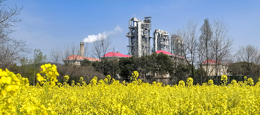 金色的油菜花遍布公司周邊,與公司內的員工宿舍和水泥窯相映成趣,勾勒出一幅絢麗多彩的春日田園畫卷。