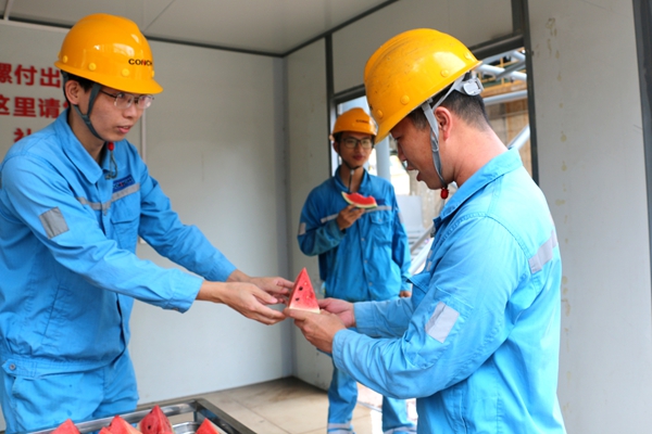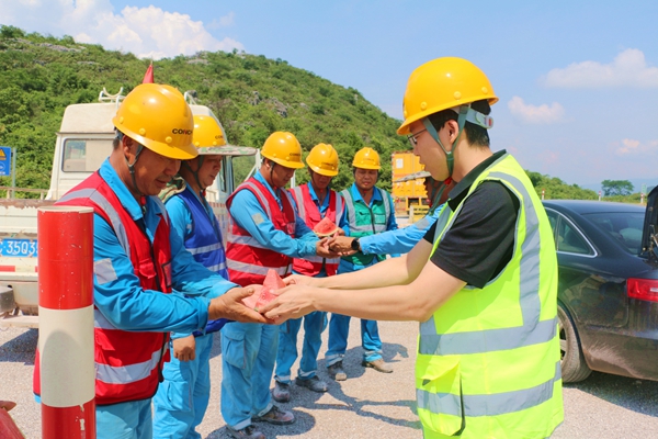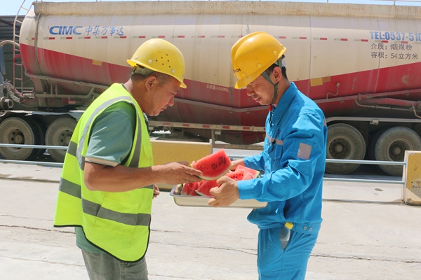 “大家辛苦了!一定要注意勞逸結合。”公司慰問組反復叮囑各班組長科學調配作業時間,礦山分廠爆破安全員熊師傅接過鹽汽水,臉上洋溢著笑容:“公司這么關心我們,這份清涼來得太及時了,我們一定加倍努力,保障生產安全高效!”