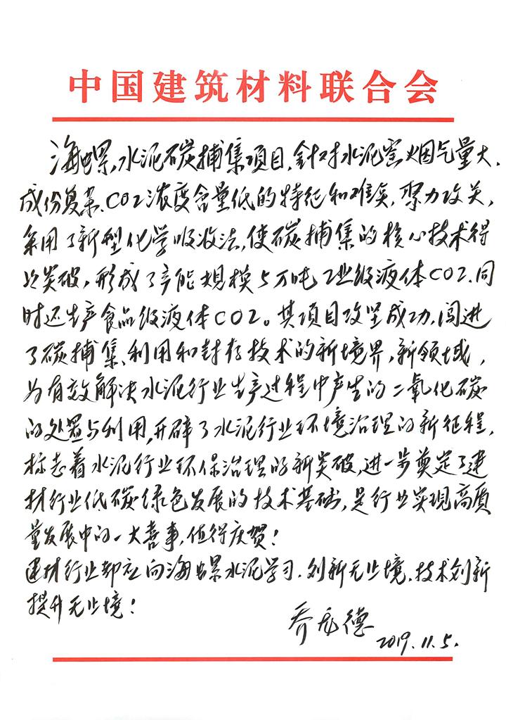 2019年11月5日,中國建筑材料聯合會會長喬龍德致信海螺集團,對海螺水泥碳捕集項目給予高度評價,表示慶賀,號召建材行業向海螺水泥學習。