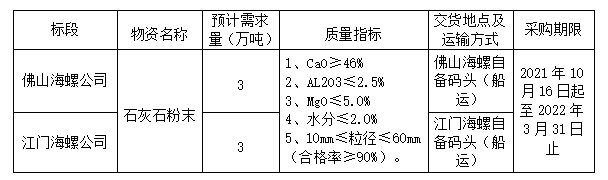 安徽海螺水泥股份有限公司廣東區(qū)域下屬的佛山、江門、海螺兩家家公司擬聯(lián)合開展石灰石粉末公開招標(biāo)工作,為進(jìn)一步體現(xiàn)公平、公正、公開的原則,拓寬采購(gòu)渠道,提高采購(gòu)質(zhì)量,現(xiàn)將相關(guān)事宜公告如下: