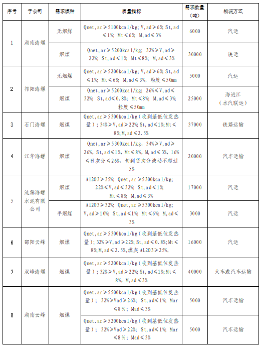 1.湖南海螺、祁陽海螺無煙煤,漣源海螺半煙煤對供應商的投標供貨能力不限制;