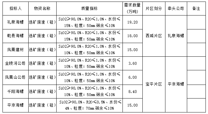 根據(jù)禮泉海螺、平?jīng)龊B荨⑶ш柡B荨⑶h海螺、金陵河公司、鳳凰山公司及鳳凰建材等7家公司生產(chǎn)經(jīng)營計(jì)劃,現(xiàn)擬對2022年生產(chǎn)用選礦廢渣(硅)采購組織招標(biāo),為進(jìn)一步體現(xiàn)公平、公正、公開透明的原則,此次招標(biāo)將在安徽海螺水泥股份有限公司陽光采購平臺公開進(jìn)行,現(xiàn)將招標(biāo)采購信息發(fā)布如下: