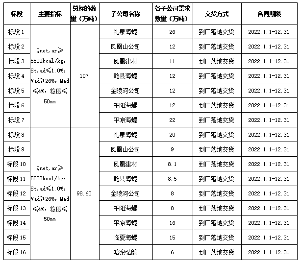 根據2022年陜甘區域各子公司煤炭需求,為保障各公司生產,擬對2022年煤炭采購進行公開招標,為體現公平、公正、公開的原則,此次招標將在安徽海螺水泥股份有限公司陽光采購平臺公開進行,現將招標相關事宜公告如下: