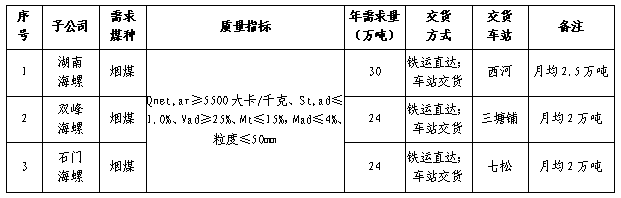 根據2022年海螺水泥湖南區域湖南海螺水泥有限公司(以下,簡稱“湖南海螺”)、雙峰海螺水泥有限公司(以下,簡稱“雙峰海螺”)、石門海螺水泥有限責任公司(以下,簡稱“石門海螺”)三家子公司的鐵路直供煤炭需求,現海螺水泥湖南區域煤炭招標小組擬對湖南區域2022年鐵路直供煤炭進行網上公開招標,以選定中標人。本次招標由湖南海螺牽頭組織,為拓寬采購渠道,同時體現公平、公正、公開原則,現將招標相關事宜公告如下: