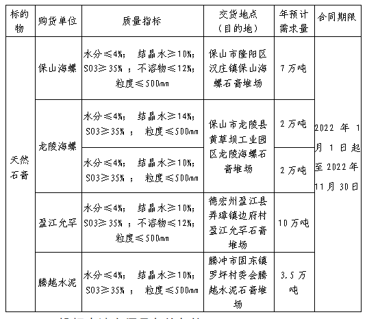 云南區域云西片區海螺公司擬對2022年度天然石膏進行招標采購,選定中標人。本次招標由云南區域保山海螺水泥有限責任公司負責組織實施。為體現公平、公正、公開的原則,拓寬采購渠道,通過網上海螺物資陽光采購平臺(網址http://ygcg.conch.cn)進行公開招標,現將相關事宜公示如下: