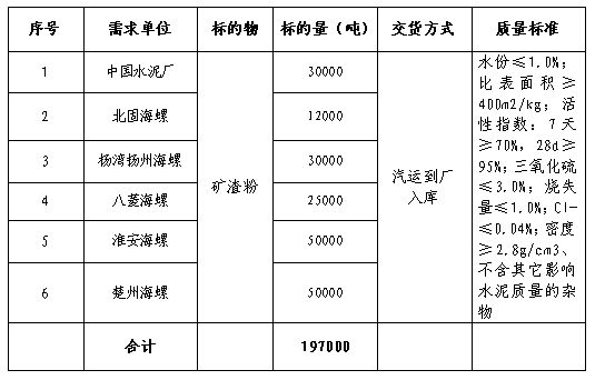 根據生產經營需求,本著“公開、公平、公正、誠實信用和競爭、擇優”原則,海螺水泥江蘇區域下屬中國水泥廠、北固海螺、楊灣海螺、揚州海螺、八菱海螺、淮安海螺、楚州海螺等七家公司擬聯合開展礦渣粉公開招標,歡迎具備條件的單位參加,現將招標相關事項公示如下: