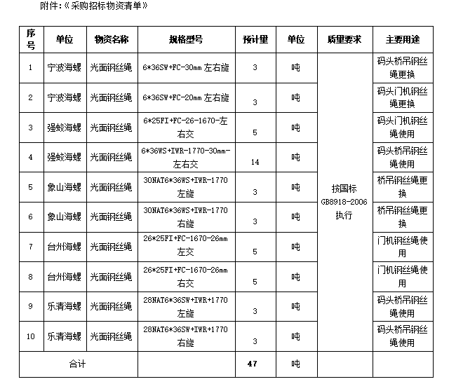 2022年度浙江區域五家子公司(寧波海螺、象山海螺、強蛟海螺、臺州海螺、樂清海螺)因生產維修需要,需對碼頭門機及日常生產所用鋼絲繩進行招標。為進一步體現公平、公正、公開的原則,拓寬采購渠道,提高采購質量,現將相關事宜公告如下: