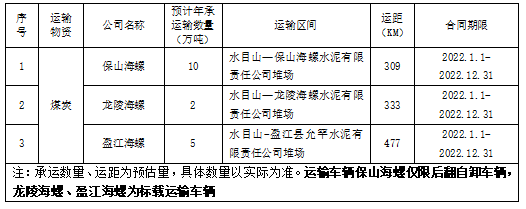 盈江海螺擬對云西片區2022年度水目山站原煤短倒運輸進行公開招標,選定中標單位,現將相關事宜公示如下: