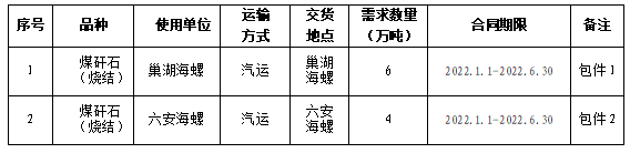 巢湖海螺水泥有限責(zé)任公司、六安海螺水泥有限責(zé)任公司擬對2022年上半年煤矸石(燒結(jié))采購進(jìn)行公開招標(biāo),選定中標(biāo)人。現(xiàn)將相關(guān)事宜公告如下: