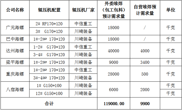 2.標的數量:?輥面堆焊焊絲(包工包料)年預計需求119噸;?耐磨焊絲年預計需求9.9噸;預計采購總額約813.10萬元,實際以各公司最終需求數量為準。