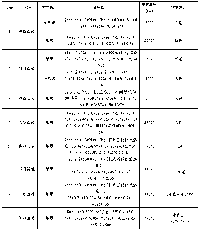 根據(jù)2021年12月21日-2022年1月20日海螺水泥湖南區(qū)域各子公司煤炭需求,現(xiàn)擬對煤炭進(jìn)行公開招標(biāo),選定中標(biāo)人,為體現(xiàn)公平、公正、公開的原則,拓寬采購渠道,現(xiàn)將招標(biāo)相關(guān)事宜公告如下: