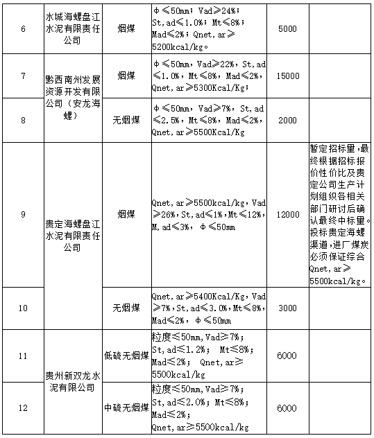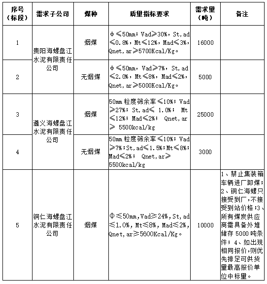海螺水泥貴州區域擬對2021年12月21日至2022年1月20日生產用煤炭進行公開招標,選定中標單位,現將相關招標事宜公示如下: