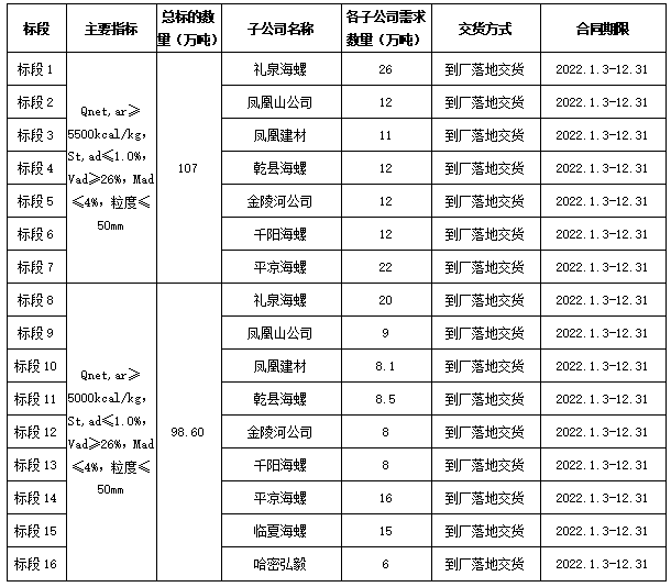 根據2022年陜甘區域各子公司煤炭需求,為保障各公司生產,擬對2022年煤炭采購進行公開招標,為體現公平、公正、公開的原則,此次招標將在安徽海螺水泥股份有限公司陽光采購平臺公開進行,現將招標相關事宜公告如下: