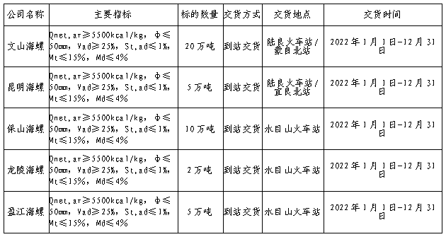 根據(jù)2022年區(qū)域內(nèi)五公司煤炭需求,為保障各公司生產(chǎn),文山海螺水泥有限責(zé)任公司擬對(duì)2022年直供煤炭采購進(jìn)行公開招標(biāo),為體現(xiàn)公平、公正、公開的原則,同時(shí)為拓寬采購渠道,降低采購成本,現(xiàn)將招標(biāo)相關(guān)事宜公告如下: