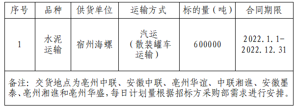 為做好2022年度宿州海螺水泥有限責任公司(以下簡稱:宿州海螺)至安徽墨泰、安徽中聯、亳州華誼、亳州湘譙、亳州中聯、中聯湘譙和亳州華盛水泥運輸招標工作,由安徽海螺綠色新材料有限公司采購部牽頭,對宿州海螺水泥運輸進行公開招標,特將本次招投標的有關事宜公告如下:
