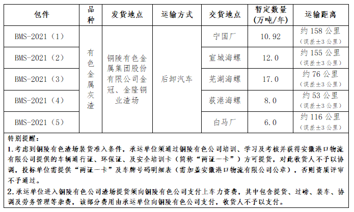 4.2 本次招標活動要求投標單位具有運輸保供經驗(要求提供相關證明)和強大的保供能力(在遵守2011年7月1日、2011年8月1日和2014年6月1日及2016年9月21日頒布的《公路安全保護條例》、《公路超限檢測站管理辦法》及《安徽省治理貨物運輸車輛超限超載條例、《超限運輸車輛行駛公路管理規定》等法律、法規的前提下,24小時有色金屬灰渣運輸能力須達到2000噸,招標人根據國家核載車型載重噸位標準審查投標人承運車數是否能夠滿足運力要求,必須具有足夠的運輸車輛合法運載,且承運車輛必須為后卸式,滿足招標單位24小時運輸要求,不能影響招標單位正常的生產經營活動。