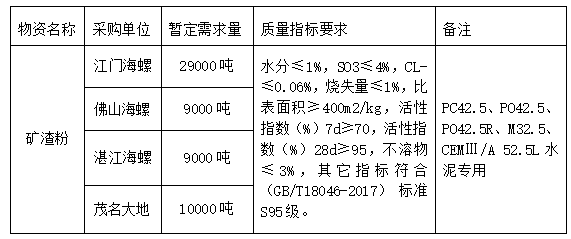 按照廣東區(qū)域供應專業(yè)組2022年招標計劃安排,安徽海螺水泥股份有限公司廣東區(qū)域下屬的江門海螺、佛山海螺、湛江海螺、茂名大地四家公司擬對2022年2季度礦渣粉采購進行聯(lián)合公開招標,為進一步體現(xiàn)公平、公正、公開的原則,拓寬采購渠道,提高采購質量,現(xiàn)將相關事宜公告如下: