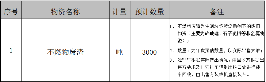 2. 不燃物廢渣為生活垃圾焚燒系統(tǒng)焚燒后的廢舊物資,從中標日起截止2023年4月14日期間垃圾焚燒所產生的不燃物廢渣,均由中標單位根據招標方要求分批次進行回收,現(xiàn)場直接裝車過磅,所產生的一切費用包含在投標報價內。