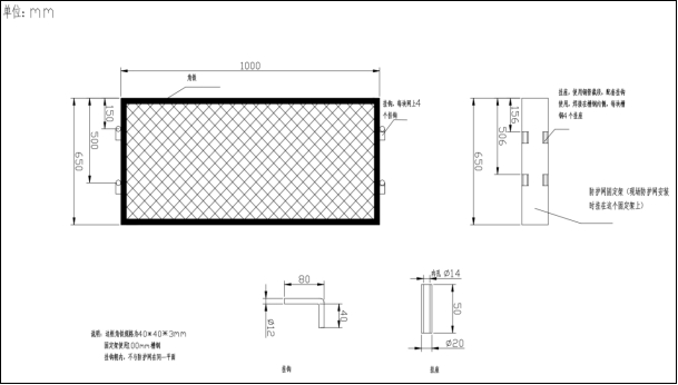 所有網孔統一規格:長節距22mm,短節距15mm,梗寬2mm。邊框角鐵:40*40*3mm;連接方式分A和B兩種,詳見圖紙。 |