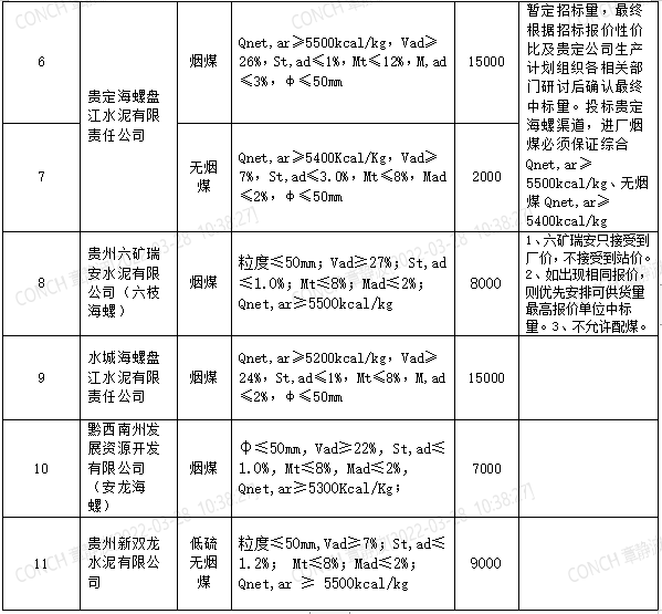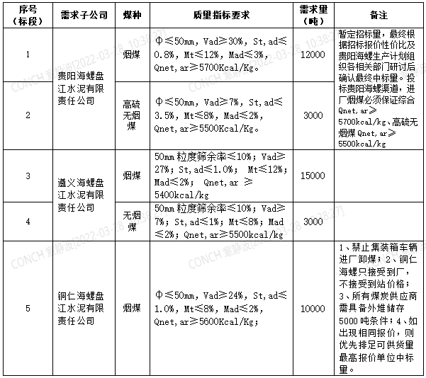 海螺水泥貴州區域擬對2022年4月21日至2022年5月20日生產用煤炭進行公開招標,選定中標單位,現將相關招標事宜公示如下: