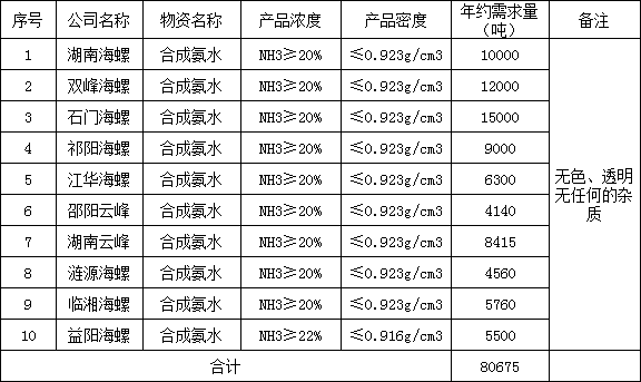 1、標的內容:合成氨水NH3≥20%、密度≤ 0.923g/cm3(其中益陽海螺合成氨水NH3≥22%、、密度≤ 0.916g/cm3),產品質量應符合國家工業氨水標準HG1-88-81《氨水》;