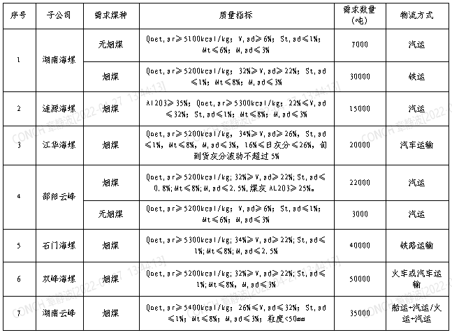 根據2022年5月21日-2022年6月20日海螺水泥湖南區域各子公司煤炭需求,現擬對煤炭進行公開招標,選定中標人,為體現公平、公正、公開的原則,拓寬采購渠道,現將招標相關事宜公告如下: