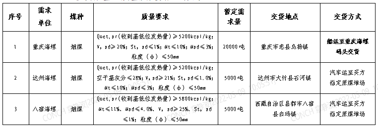 達州海螺報價要求為一票制汽運至買方原煤堆場交貨價(含13%增值稅),賣方負責到廠卸貨到買方指定地點;