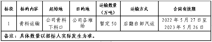 (二)2022年5月18日9:00至2022年5月21日9:00在禮泉海螺物資陽光采購平臺發布骨料運輸招標公告,同步在禮泉海螺公司大門、開票大廳、直供電廠及礦點等發布招標公告,同時在當地主要報社進行公告,并接受報名;