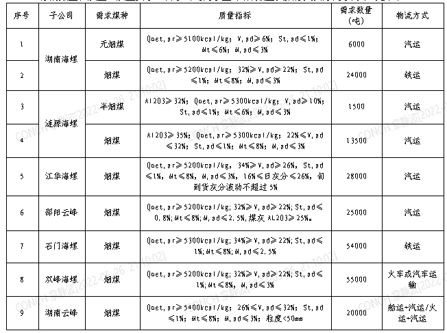 根據(jù)2022年6月21日-2022年7月20日海螺水泥湖南區(qū)域各子公司煤炭需求,現(xiàn)擬對(duì)煤炭進(jìn)行公開招標(biāo),選定中標(biāo)人,為體現(xiàn)公平、公正、公開的原則,拓寬采購渠道,現(xiàn)將招標(biāo)相關(guān)事宜公告如下:
