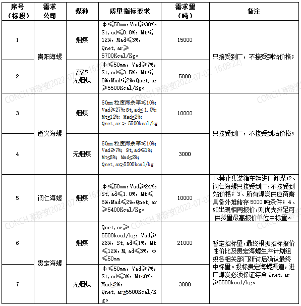 海螺水泥貴州區域擬對2022年7月21日至2022年8月20日生產用煤炭進行公開招標,選定中標單位,現將相關招標事宜公示如下: