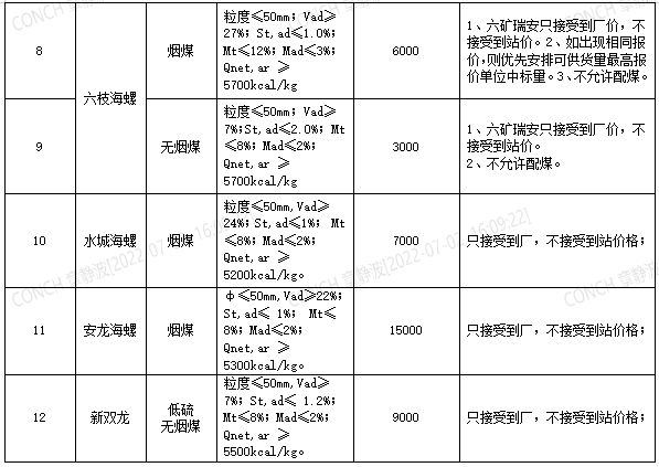 6.2022年7月21日至2022年8月20日合同期內,若中標單位在2022年8月6日24時前供貨量(銷發系統進廠數量)小于合同約定量的30%的中標單位,不予以參與海螺水泥貴州區域2022年8月21日至2022年9月20日煤炭招標(僅買方原因或不可抗力因素除外,鐵路在途和在站煤炭不給予納入供貨量,僅以進廠數量為準),并取消在貴州區域所有海螺6個月內的投標資格。