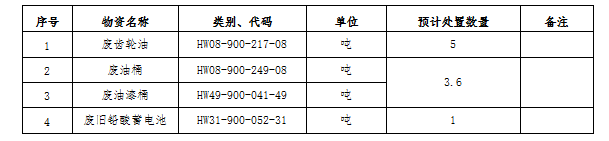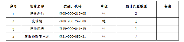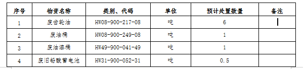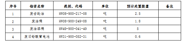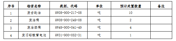 (一)標的內容及處置數量:廢礦物油、廢油桶、廢油漆桶、廢鉛酸蓄電池等危廢材料。處置數量以區域內5家公司(南通海螺、海門海螺、太倉海螺、海螺明珠、張家港海螺)實際過磅為準。