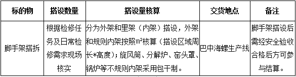 根據巴中海螺生產經營需求,為保障回轉窯、水泥磨及生產設備實施檢修期間的施工安全、質量和進度受控,部分區域需搭設腳手架。為確保腳手架搭設業務開展的合規性,本著公平、公正、公開、透明的原則,現將招標相關事宜公告如下: