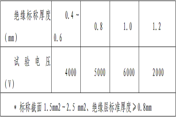絕緣線芯應經受下表規定的交流50Hz電壓火花試驗。(火花試驗應保證絕緣每點上經受電壓的作用時間不少于0.2s)。