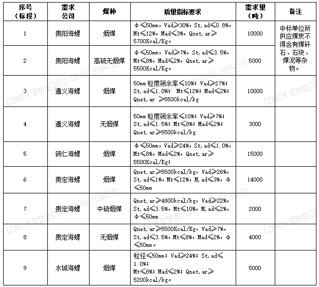 海螺水泥貴州區(qū)域擬對2022年10月21日至2022年11月20日生產(chǎn)用煤炭進(jìn)行公開招標(biāo),選定中標(biāo)單位,現(xiàn)將相關(guān)招標(biāo)事宜公示如下: