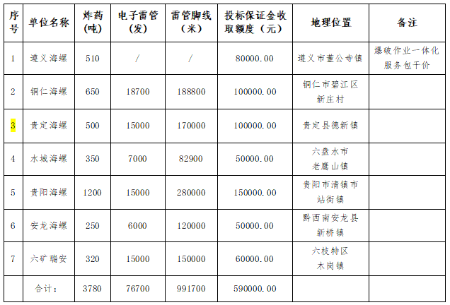 投標人在報價時應綜合考慮炸藥以及電子雷管的使用量、運輸、人工成本以及爆破作業中一切不確定因素,具體詳見報價表,結合備注信息合理報價。投標人在報價時應綜合考慮炸藥以及電子雷管的使用量、運輸、人工成本以及爆破作業中一切不確定因素,具體詳見報價表,結合備注信息合理報價。根據國家法律法規規定,同一家單位不能同時做外委爆破、安全監理和安全評估,若一家單位同時參與三個標段投標,則優先考慮外委爆破標段,其次是安全監理標段,最后是安全評估標段。