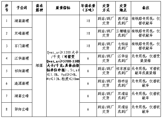 根據2023年海螺水泥湖南區域相關子公司:湖南海螺水泥有限公司(以下,簡稱“湖南海螺”)、雙峰海螺水泥有限公司(以下,簡稱“雙峰海螺”)、石門海螺水泥有限責任公司(以下,簡稱“石門海螺”)、江華海螺水泥有限責任公司(以下,簡稱“江華海螺”)、祁陽海螺水泥有限責任公司(以下,簡稱“祁陽海螺”)、漣源海螺水泥有限責任公司(以下,簡稱“漣源海螺”)、湖南省云峰水泥有限公司(以下,簡稱“湖南云峰”)、邵陽市云峰新能源科技有限公司(以下,簡稱“邵陽云峰”)8家子公司的非統購直供煤炭采購需求,擬組織湖南區域2023年非統購煤炭直供渠道準入網上公開招標,選定中標人。本次招標由區域物資采購中心牽頭,湖南海螺組織,為拓寬采購渠道,同時體現公平、公正、公開原則,現將招標相關事宜公告如下:
