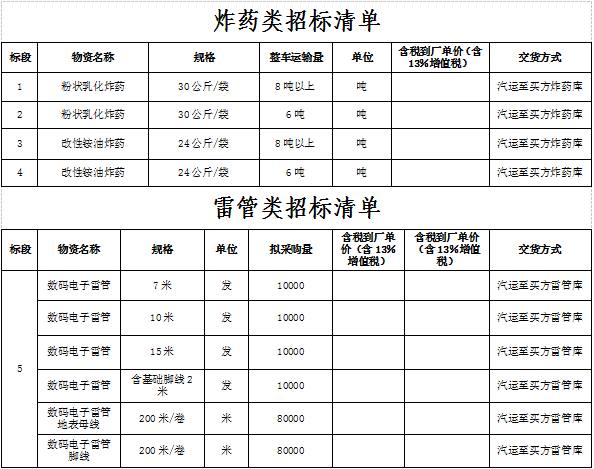 1.招標物資名稱:火工材料(改性銨油炸藥、粉狀乳化炸藥、工業雷管及導爆管)。