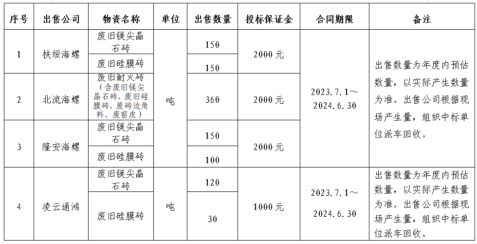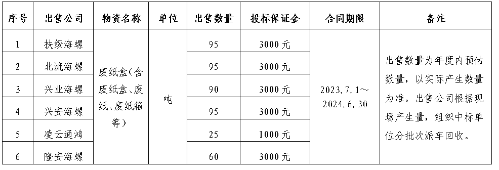 為規范區域內各公司自動插袋包裝機所用自動袋外包裝紙盒(簡稱:廢紙盒)、廢舊耐火磚出售管理,保證廢紙盒、廢舊耐火磚出售過程的公開、公平、公正,擬開展廣西區域2023-2024年度廢紙盒、廢舊耐火磚出售招標工作,現將招標信息公示如下: