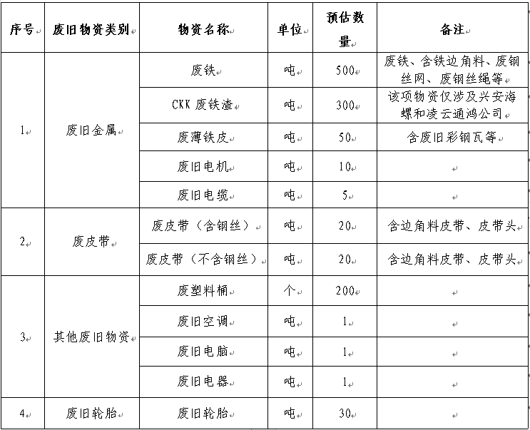 1.包含但不限于以上廢舊物資類別,同時數量僅為預估數量,具體數量以實際過磅或點數回收數量為準。