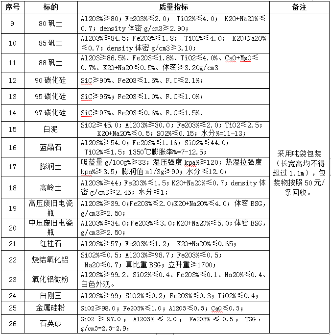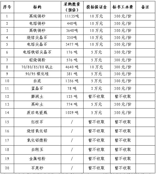4、上述88礬土、97碳化硅、紅柱石、燒結氧化鋁、白剛玉、金屬硅粉和石英砂等招標采購原材料,因采購量不確定,本次招標僅作為本公司采購備用原材料。考慮上述原材料存在無執行情況,投標保證金、標書工本費和合同履約保證金暫不收取。