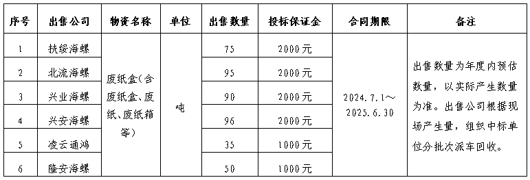 為規范區域內各公司自動插袋包裝機所用自動袋外包裝紙盒(簡稱:廢紙盒)、廢舊耐火磚出售管理,保證廢紙盒、廢舊耐火磚出售過程的公開、公平、公正,擬開展廣西區域2024-2025年度廢紙盒、廢舊耐火磚出售招標工作,現將招標信息公示如下: